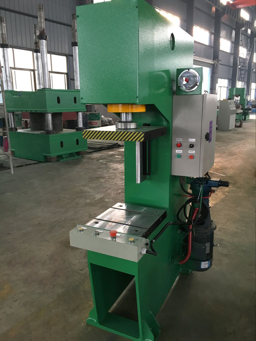 性能特點:本系列單柱式液壓機通過計算機優(yōu)化直立式C型結(jié)構(gòu)設(shè)計,剛性好,采用鋼板焊接,焊接后通過回火時效處理,確保機身永不變形。液壓系統(tǒng)安裝于機身內(nèi),外型美觀,結(jié)構(gòu)緊湊,操作方便。本系列液壓機設(shè)有獨立的液壓與電器控制系統(tǒng),采用按鈕集中控制,可實現(xiàn)定程和定壓兩種成型工藝,機器行程、壓力可在規(guī)定范圍內(nèi)調(diào)節(jié);本壓機壓頭采用四柱導(dǎo)向,具有抗偏載能力。